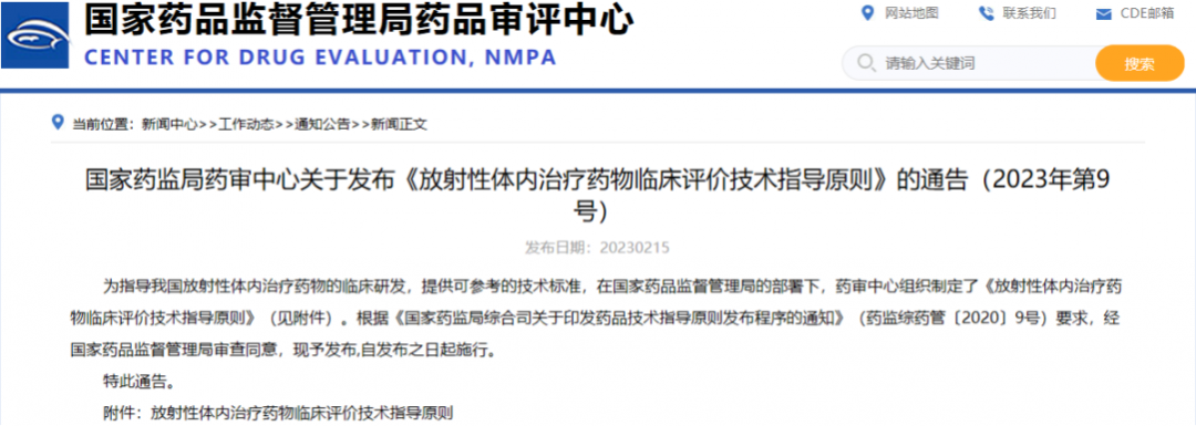國家藥監(jiān)局藥審中心關于發(fā)布《放射性體內(nèi)治療藥物臨床評價技術(shù)指導原則》的通告(2023年第9號)