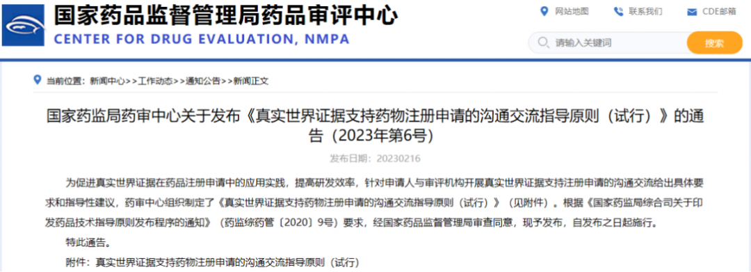 國家藥監(jiān)局藥審中心關于發(fā)布《真實世界證據(jù)支持藥物注冊申請的溝通交流指導原則(試行)》的通告(2023年第6號)