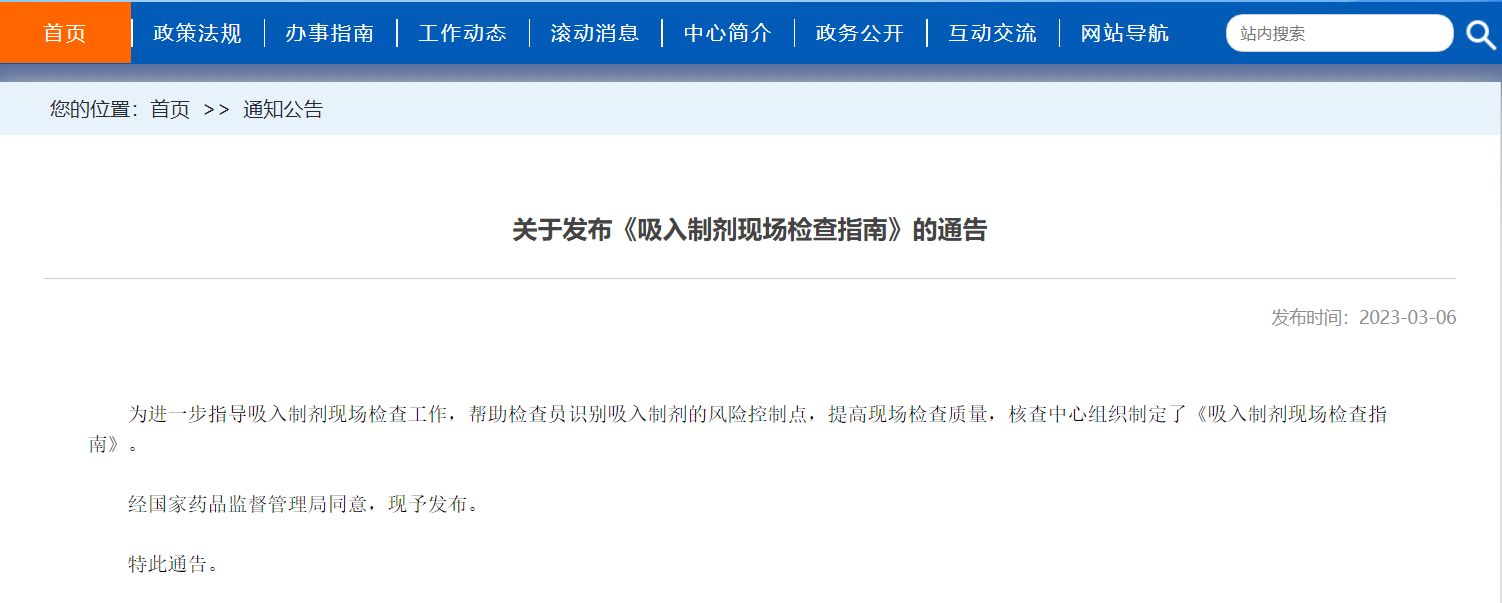國(guó)家藥監(jiān)局核查中心關(guān)于發(fā)布《吸入制劑現(xiàn)場(chǎng)檢查指南》的通告