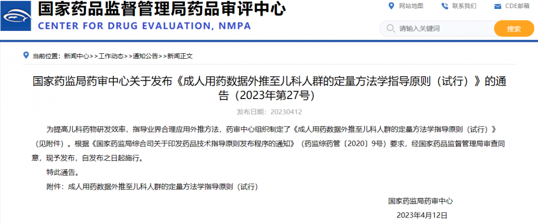 國(guó)家藥監(jiān)局藥審中心關(guān)于發(fā)布《成人用藥數(shù)據(jù)外推至兒科人群的定量方法學(xué)指導(dǎo)原則(試行)》的通告(2023年第27號(hào))