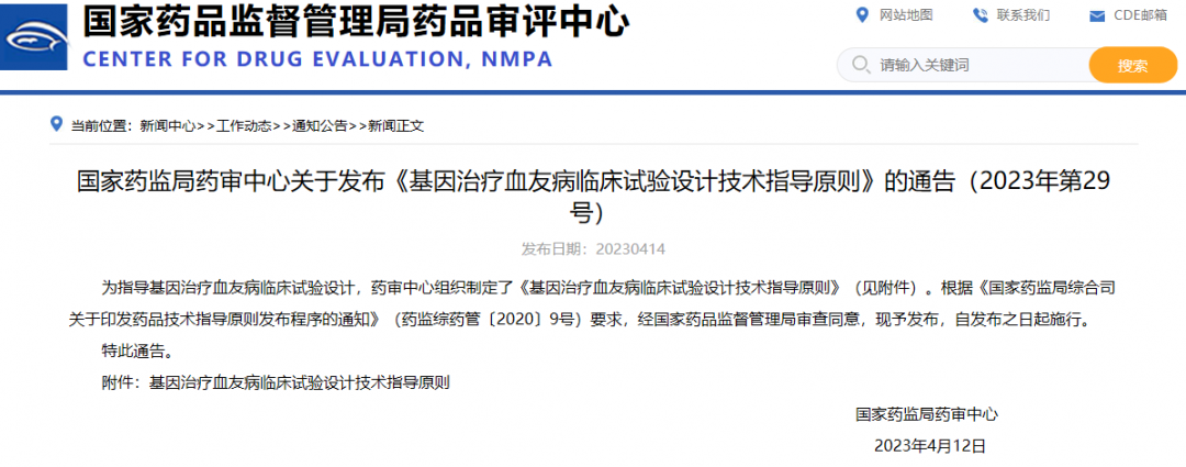 國(guó)家藥監(jiān)局藥審中心關(guān)于發(fā)布《基因治療血友病臨床試驗(yàn)設(shè)計(jì)技術(shù)指導(dǎo)原則》的通告(2023年第29號(hào))