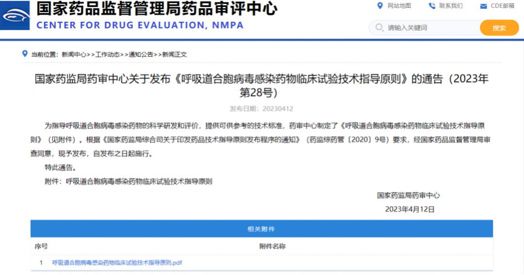國(guó)家藥監(jiān)局藥審中心關(guān)于發(fā)布《呼吸道合胞病毒感染藥物臨床試驗(yàn)技術(shù)指導(dǎo)原則》的通告(2023年第28號(hào))