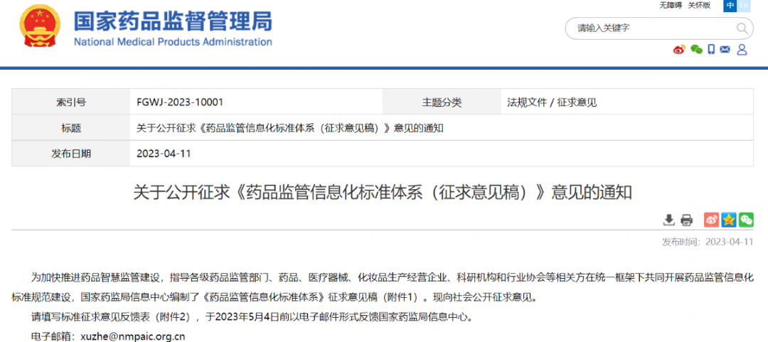 關(guān)于公開征求《藥品監(jiān)管信息化標(biāo)準(zhǔn)體系(征求意見稿)》意見的通知