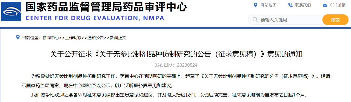 關(guān)于公開征求《關(guān)于無參比制劑品種仿制研究的公告(征求意見稿)》意見的通知