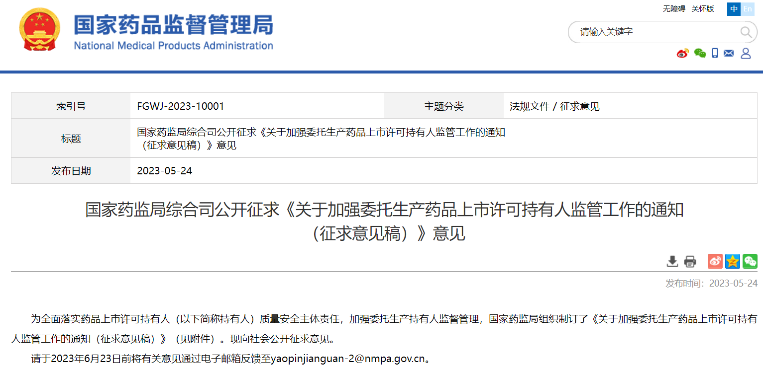 國家藥監(jiān)局綜合司公開征求《關(guān)于加強(qiáng)委托生產(chǎn)藥品上市許可持有人監(jiān)管工作的通知(征求意見稿)》意見