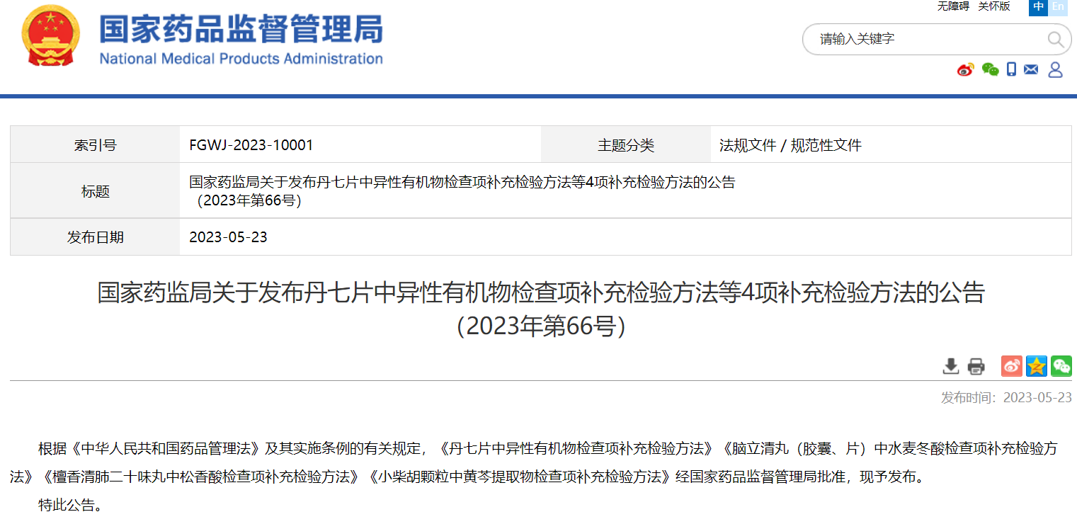 國家藥監(jiān)局關(guān)于發(fā)布丹七片中異性有機(jī)物檢查項(xiàng)補(bǔ)充檢驗(yàn)方法等4項(xiàng)補(bǔ)充檢驗(yàn)方法的公告(2023年第66號(hào))