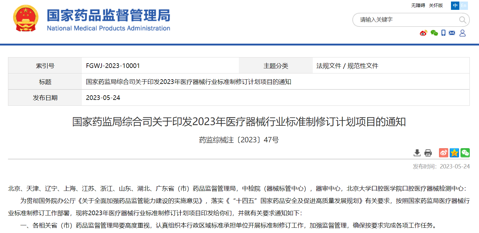 國家藥監(jiān)局綜合司關(guān)于印發(fā)2023年醫(yī)療器械行業(yè)標(biāo)準(zhǔn)制修訂計(jì)劃項(xiàng)目的通知