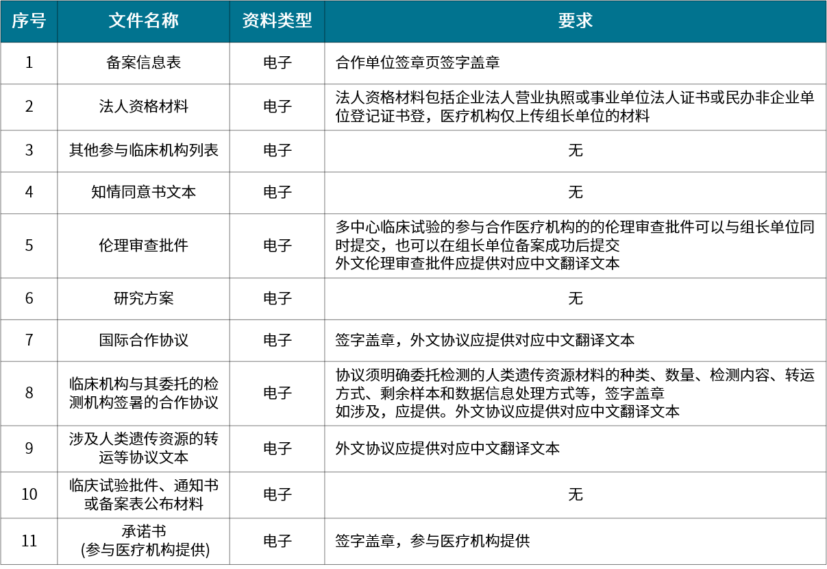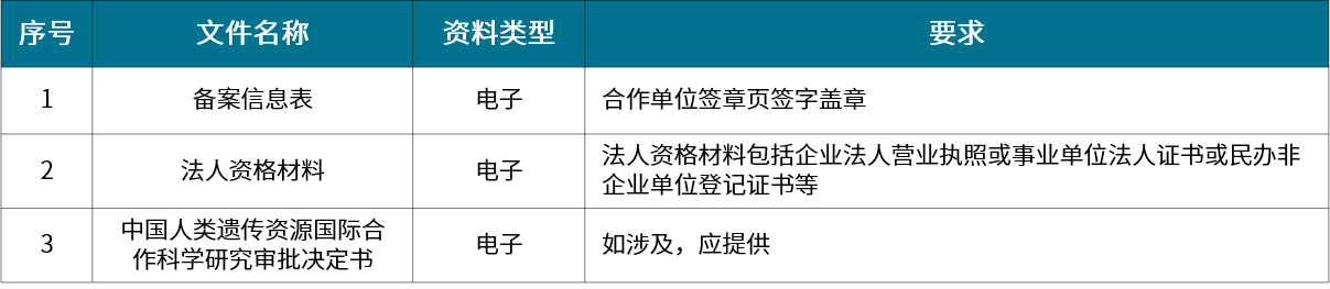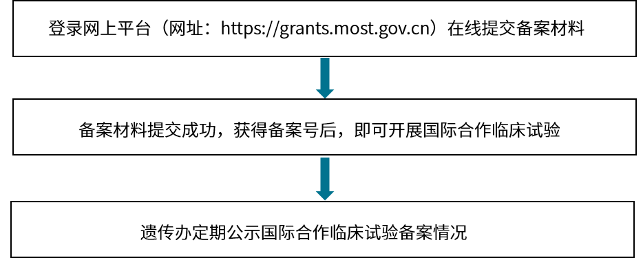 國際合作臨床試驗備案:為獲得相關藥品和醫(yī)療器械在我國上市許可,在臨床機構利用我國人類遺傳資源開展國際合作臨床試驗、不涉及人類遺傳資源材料出境