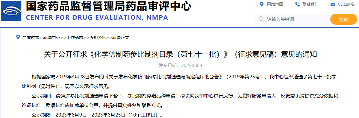 關(guān)于公開征求《化學仿制藥參比制劑目錄(第七十一批)》(征求意見稿)意見的通知