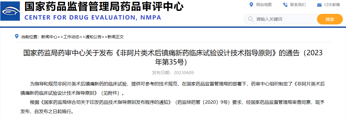 國家藥監(jiān)局藥審中心關(guān)于發(fā)布《非阿片類術(shù)后鎮(zhèn)痛新藥臨床試驗設計技術(shù)指導原則》的通告(2023年第35號)