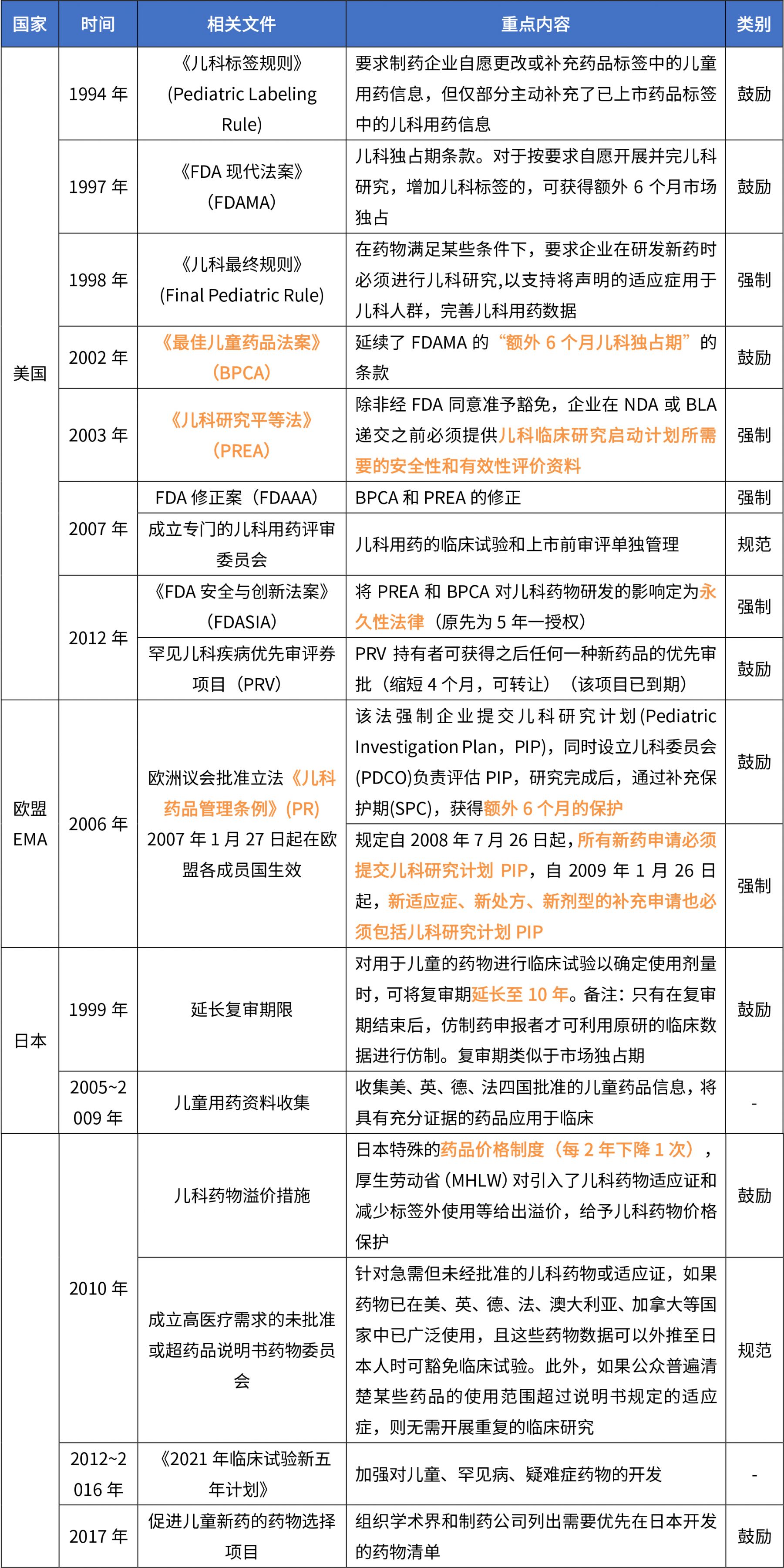 歐美日是兒科用藥政策先行者,美國(guó)、歐盟都具有專門的的兒童用藥立法,采用鼓勵(lì)+強(qiáng)制結(jié)合的協(xié)同策略促進(jìn)兒童新藥的開(kāi)發(fā)、兒童臨床試驗(yàn)的管理等。日本也通過(guò)制定各種法規(guī)來(lái)鼓勵(lì)規(guī)兒藥開(kāi)發(fā)。各國(guó)項(xiàng)目?jī)核幏ㄒ?guī)內(nèi)容見(jiàn)下表。