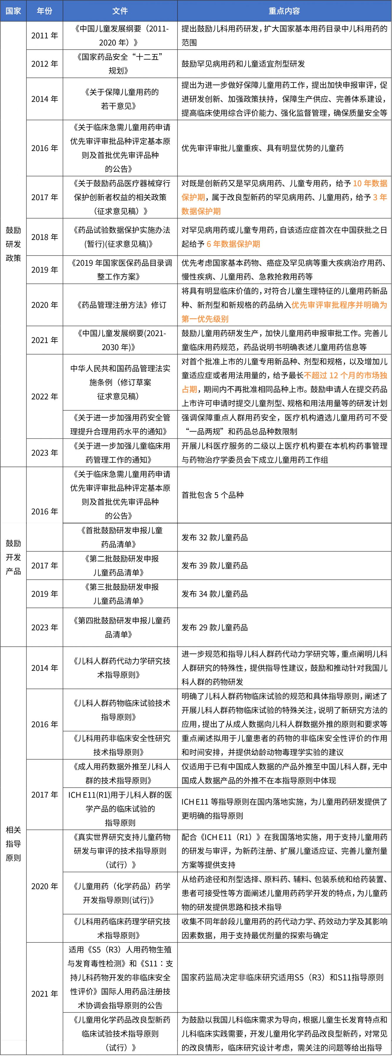在我國(guó),為鼓勵(lì)國(guó)內(nèi)藥企加大兒童藥的研發(fā)和生產(chǎn),近年來(lái),政府部門陸續(xù)出臺(tái)了一系列相關(guān)政策,包括鼓勵(lì)研發(fā)、優(yōu)先評(píng)審、加強(qiáng)醫(yī)院配備、招標(biāo)采購(gòu)直接掛網(wǎng)等,部分法規(guī)詳見(jiàn)下表。