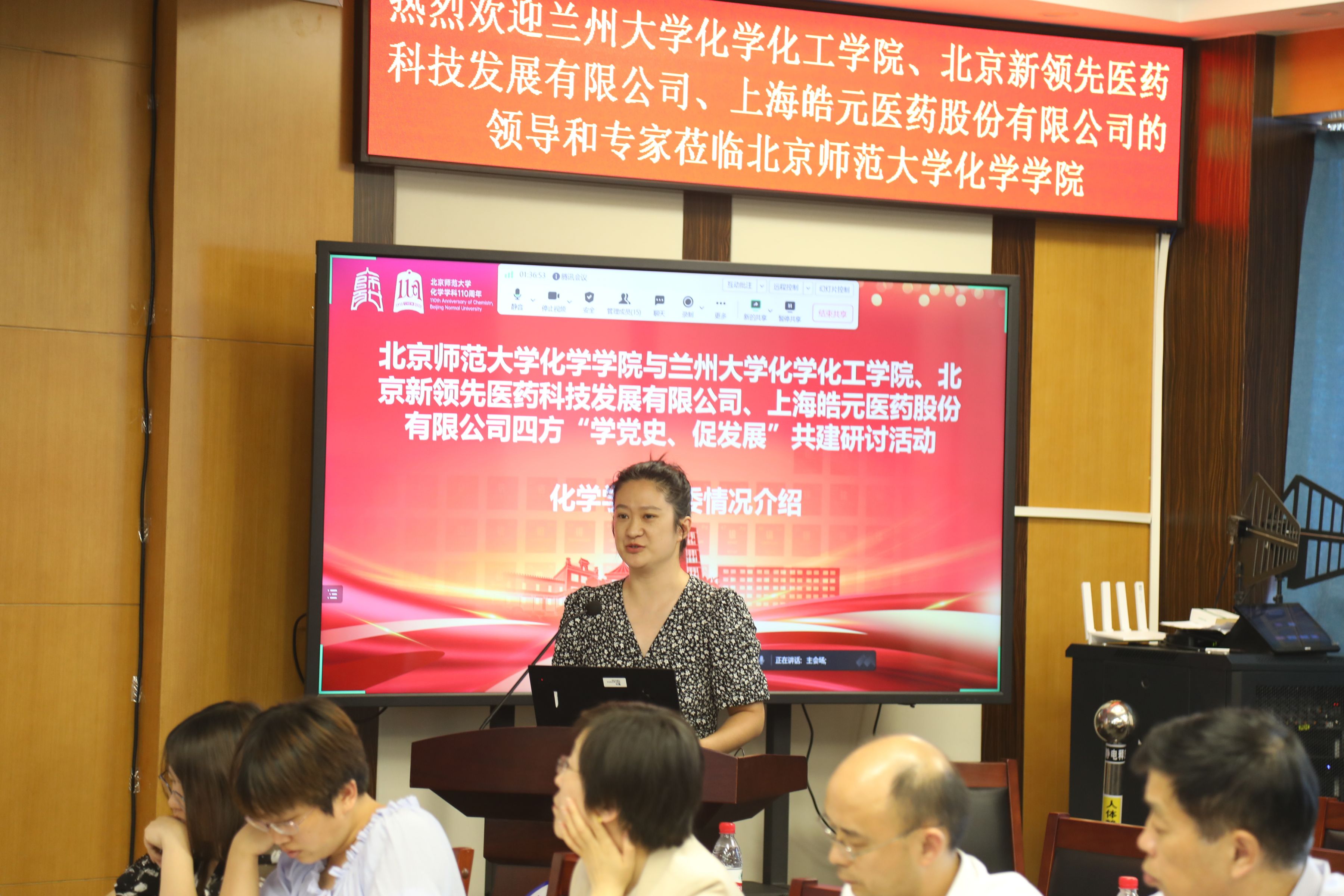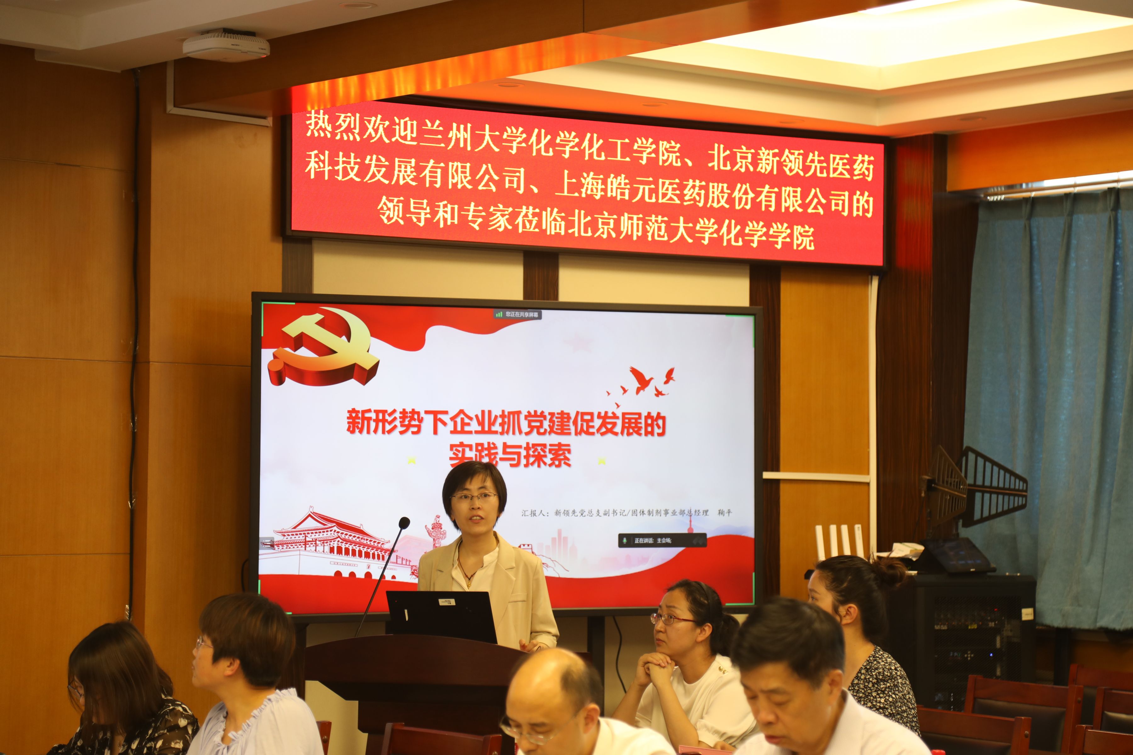 ▲ 新領先醫(yī)藥黨總支副書記、固體制劑事業(yè)部總經理鞠平女士,蘭州大學化學化工學院丁三元教授,北師大化學學院黨委辦公室主任、團委書記徐娜女士分別作黨建工作匯報