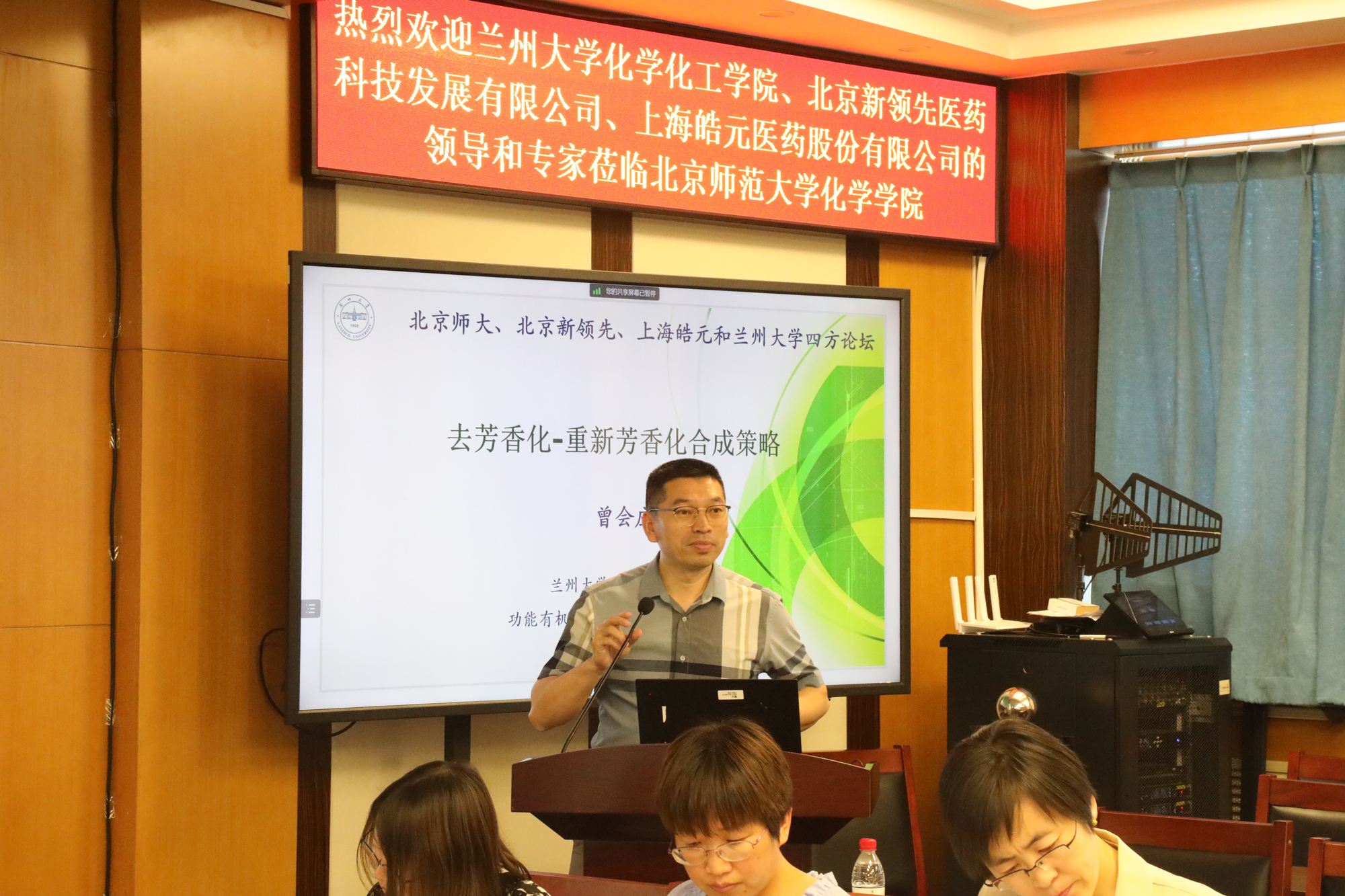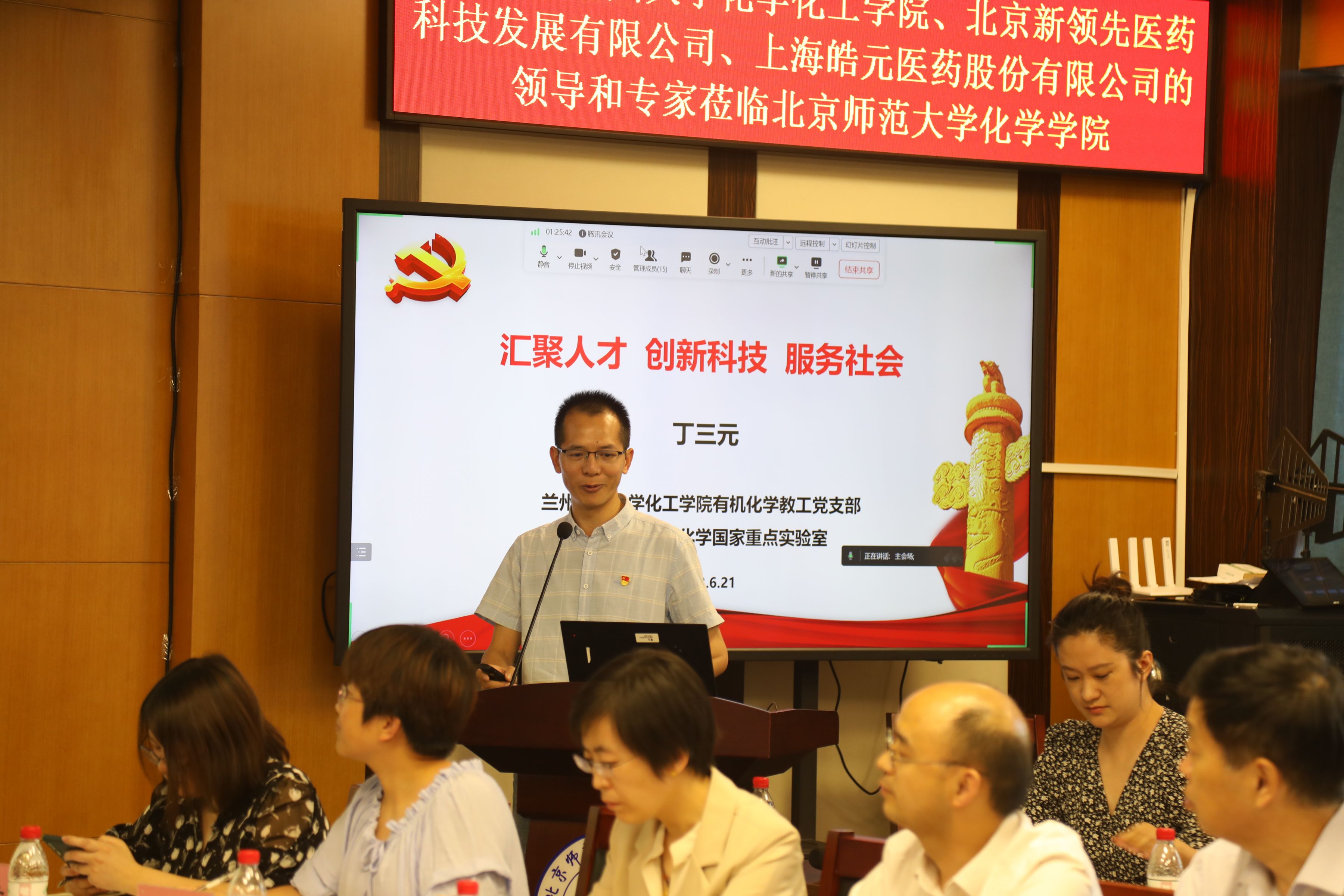 參加本次研討活動的有:北京師范大學化學學院黨委書記盧忠林教授,化學學院院長毛蘭群教授,化學學院黨委副書記韓娟博士,科研院校地合作與科研成果轉化處副處長孫根班教授;蘭州大學化學化工學院黨委書記杜生一博士,功能有機分子化學國家重點實驗室主任王為教授(線上);新領先醫(yī)藥黨總支書記、董事長陶新華先生,副總裁顏耀東先生、張翔先生,黨總支副書記、固體制劑事業(yè)部總經理鞠平女士,黨總支紀支檢委員、臨床運營部副總監(jiān)杜書青女士;上海皓元產品負責人、樂研首席科學家陳委先生等30余人。