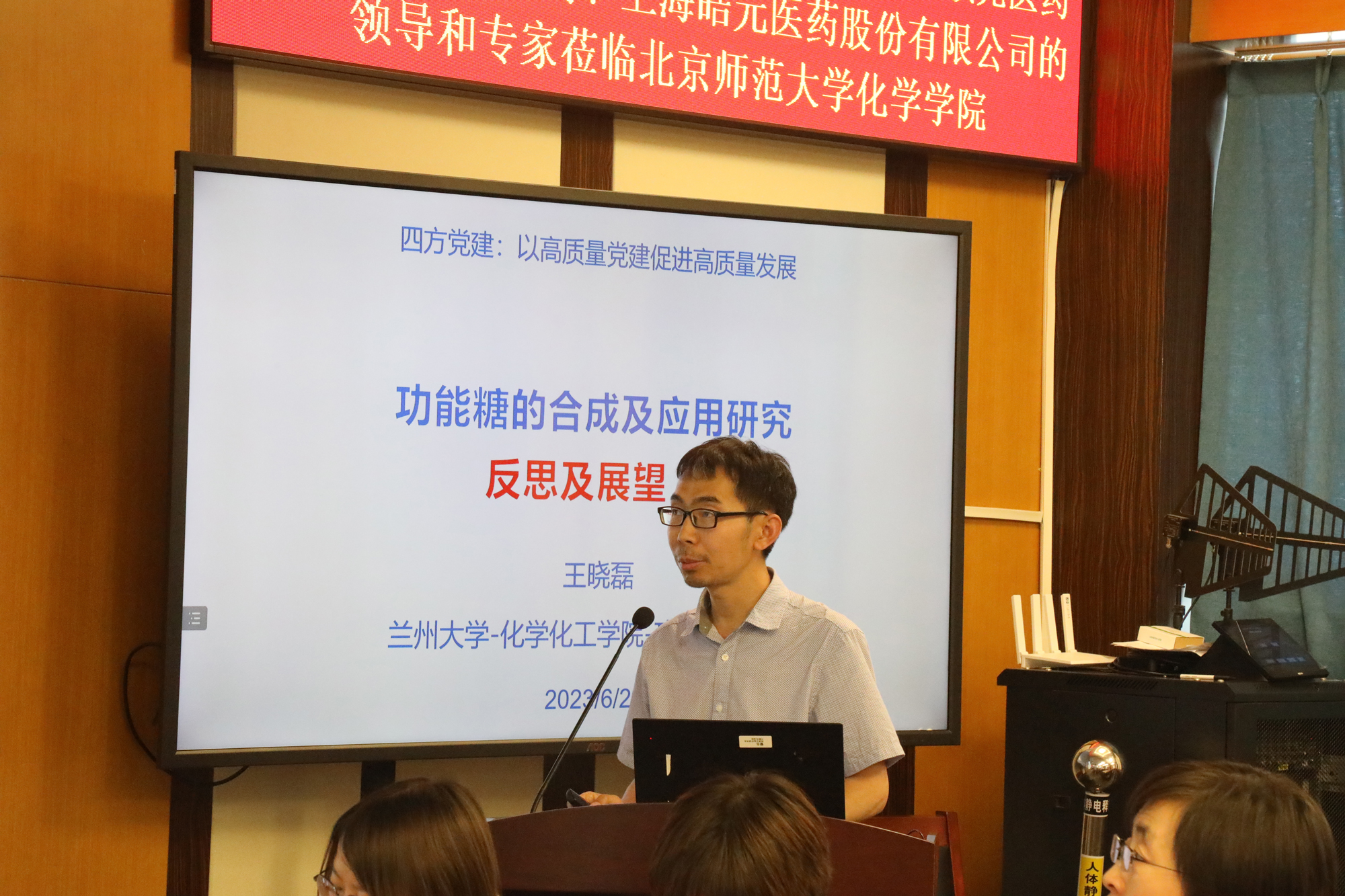 蘭州大學化學化工學院王曉磊教授、曾會應教授分別作《功能糖合成及應用研究》、《去芳香化-重新芳香化策略應用》主題分享,針對最新的研究進展與成果與在場專家領導進行分享;上海皓元醫(yī)藥產品負責人、樂研首席科學家陳委先生作《高??蒲谐晒诠酒脚_轉化的案例報告》分享,針對實際案例對公司科研成果轉化項目進行詳細介紹,為后續(xù)的產學研合作奠定基礎;北京師范大學化學學院黨委書記盧忠林教授、江迎教授分別作《藥物遞送載體的合成及性能研究》、《腦化學原位測量方法與應用基礎研究》報告分享,各方切實做到資源共享,優(yōu)勢互補。各方通過課題的深入學習和交流,組建高校-企業(yè)創(chuàng)新聯(lián)合體,通過產學研深度合作,推動開展關鍵核心技術、基礎前沿技術攻關,努力實現(xiàn)重點領域、關鍵環(huán)節(jié)自主可控的國家戰(zhàn)略部署。