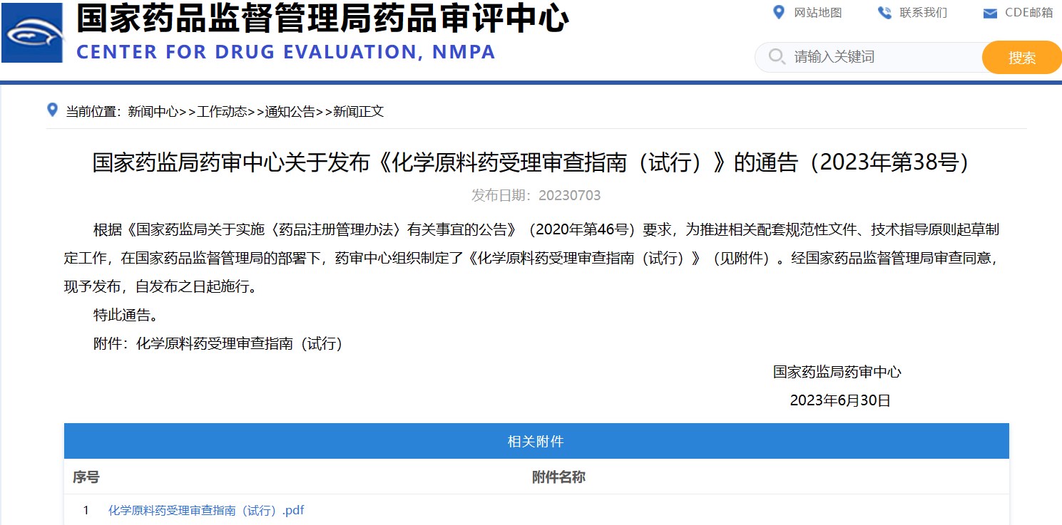國家藥監(jiān)局藥審中心關(guān)于發(fā)布《化學(xué)原料藥受理審查指南(試行)》的通告(2023年第38號(hào))