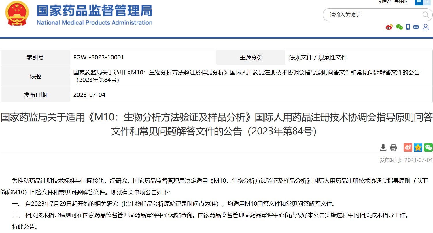 國家藥監(jiān)局關(guān)于適用《M10:生物分析方法驗(yàn)證及樣品分析》國際人用藥品注冊(cè)技術(shù)協(xié)調(diào)會(huì)指導(dǎo)原則問答文件和常見問題解答文件的公告(2023年第84號(hào))