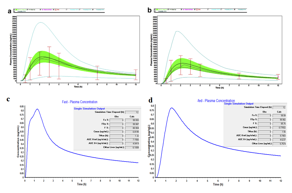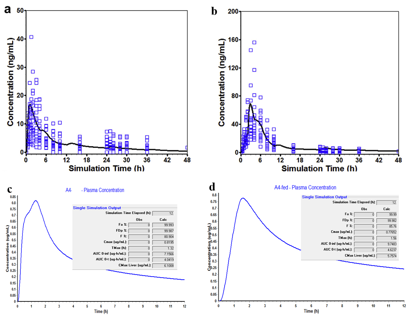 說明:a和b參考文獻(xiàn)中案例2軟件模擬和預(yù)測(cè)值,c和d是小編建模模擬值,分析由于數(shù)據(jù)信息欠缺與文獻(xiàn)值有差異,但是小編模擬結(jié)果也表明化合物2表現(xiàn)出明顯的正向食物效應(yīng)。