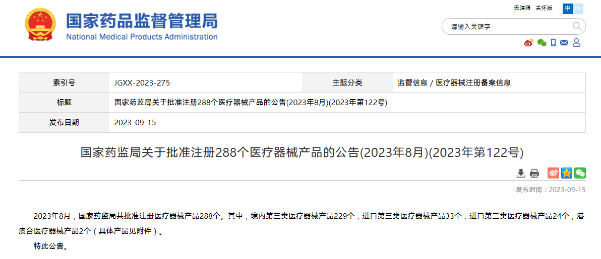 國家藥監(jiān)局關(guān)于批準(zhǔn)注冊288個(gè)醫(yī)療器械產(chǎn)品的公告(2023年8月)(2023年第122號(hào))