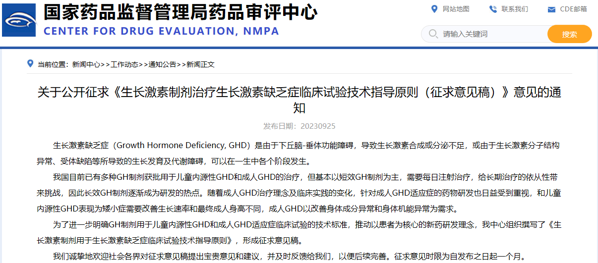 關(guān)于公開征求《生長激素制劑治療生長激素缺乏癥臨床試驗技術(shù)指導原則(征求意見稿)》意見的通知