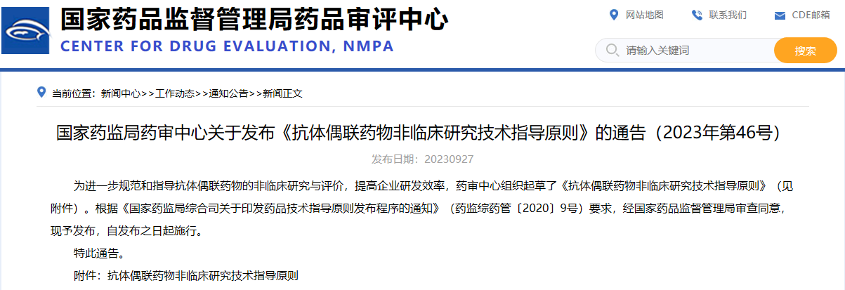 國家藥監(jiān)局藥審中心關(guān)于發(fā)布《抗體偶聯(lián)藥物非臨床研究技術(shù)指導原則》的通告(2023年第46號)