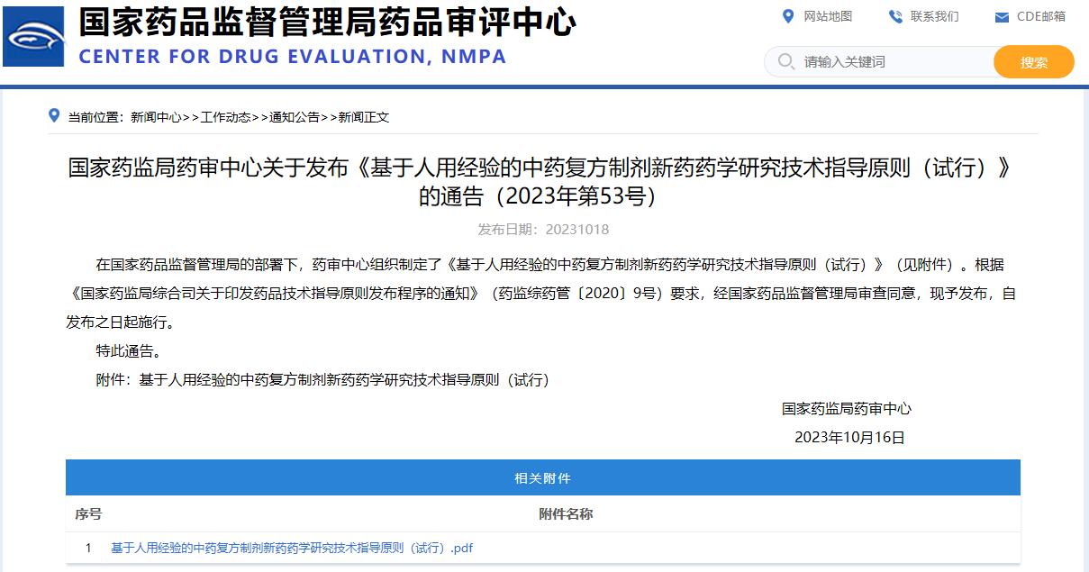 國(guó)家藥監(jiān)局藥審中心關(guān)于發(fā)布《基于人用經(jīng)驗(yàn)的中藥復(fù)方制劑新藥藥學(xué)研究技術(shù)指導(dǎo)原則(試行)》的通告(2023年第53號(hào))