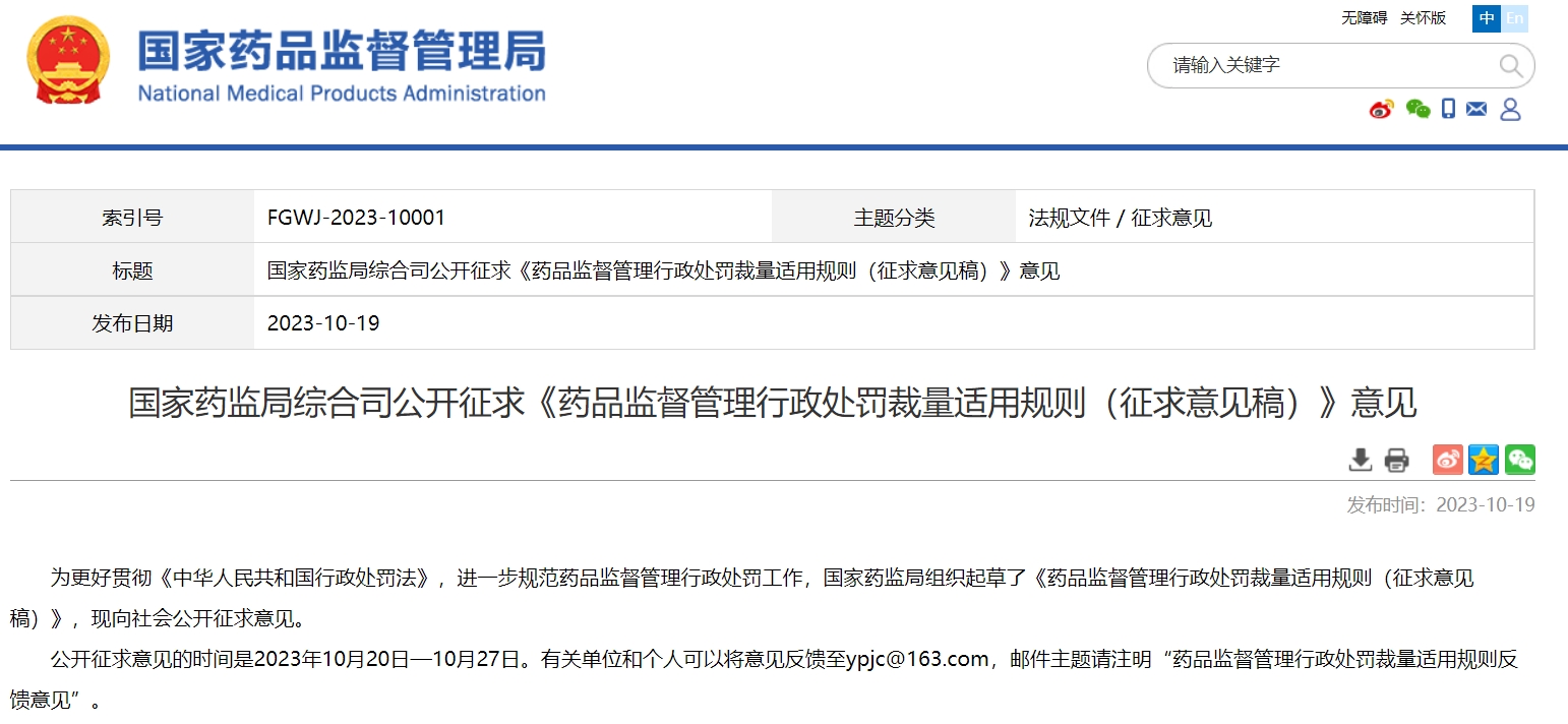 國(guó)家藥監(jiān)局綜合司公開(kāi)征求《藥品監(jiān)督管理行政處罰裁量適用規(guī)則(征求意見(jiàn)稿)》意見(jiàn)