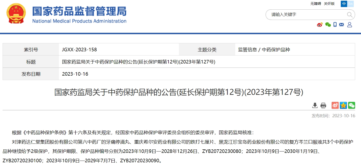 國(guó)家藥監(jiān)局關(guān)于中藥保護(hù)品種的公告(延長(zhǎng)保護(hù)期第12號(hào))(2023年第127號(hào))
