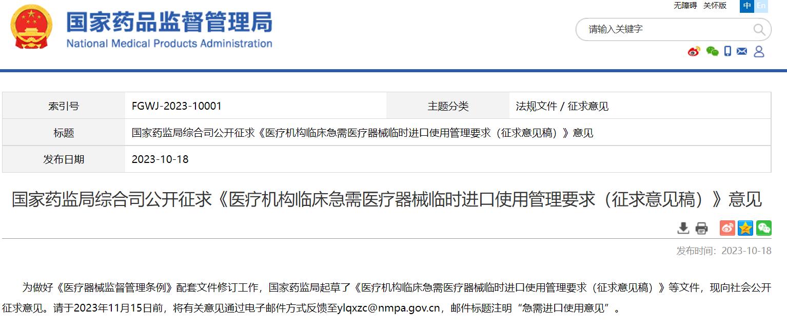 國(guó)家藥監(jiān)局綜合司公開(kāi)征求《醫(yī)療機(jī)構(gòu)臨床急需醫(yī)療器械臨時(shí)進(jìn)口使用管理要求(征求意見(jiàn)稿)》意見(jiàn)