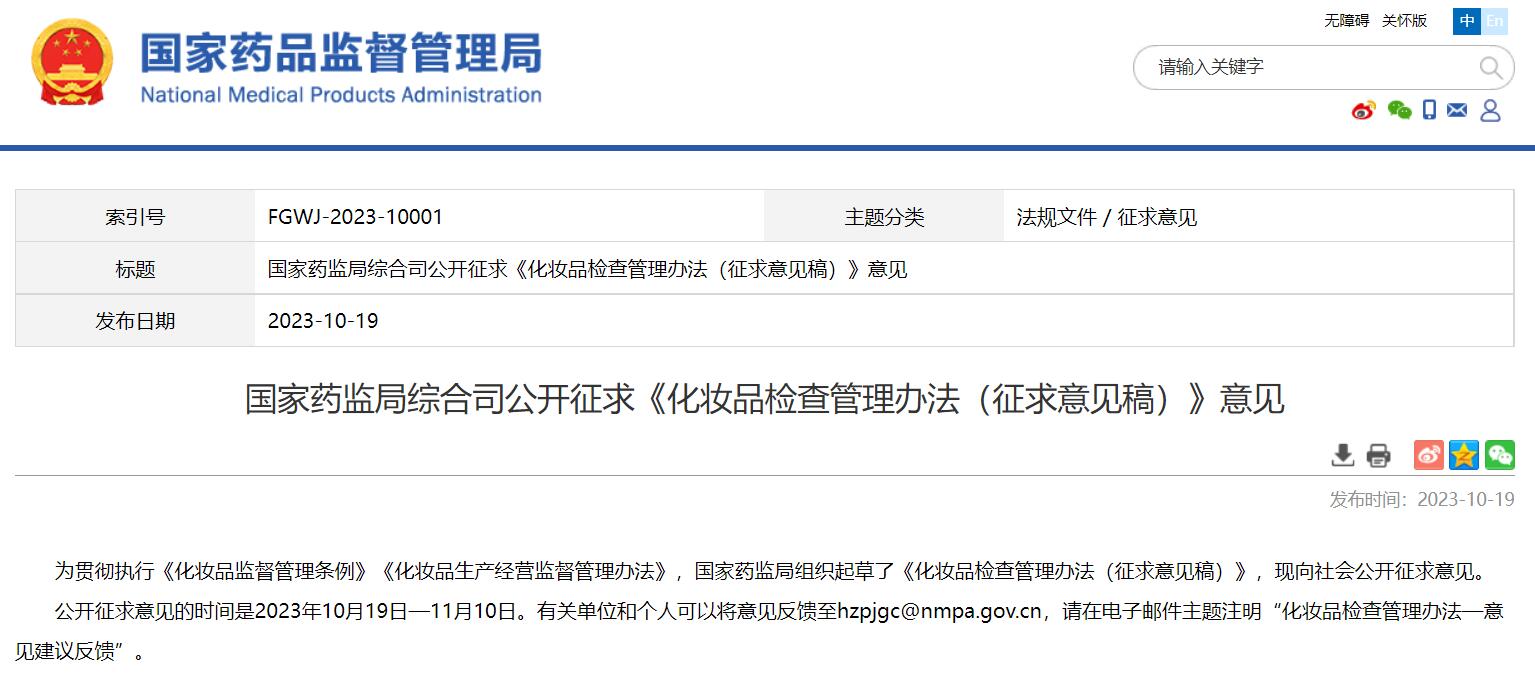 國(guó)家藥監(jiān)局綜合司公開(kāi)征求《化妝品檢查管理辦法(征求意見(jiàn)稿)》意見(jiàn)