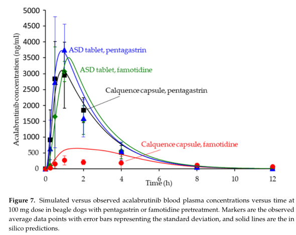 文章中模擬固體分散體片和Calquence膠囊同法莫替?。╢amotidine,ARAs)、五肽胃泌素(pentagastrin)服用血藥濃度時間曲線如下: