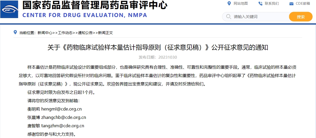 關(guān)于《藥物臨床試驗(yàn)樣本量估計(jì)指導(dǎo)原則(征求意見稿)》公開征求意見的通知