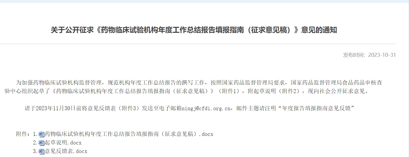 關(guān)于公開征求《藥物臨床試驗(yàn)機(jī)構(gòu)年度工作總結(jié)報(bào)告填報(bào)指南(征求意見稿)》意見的通知