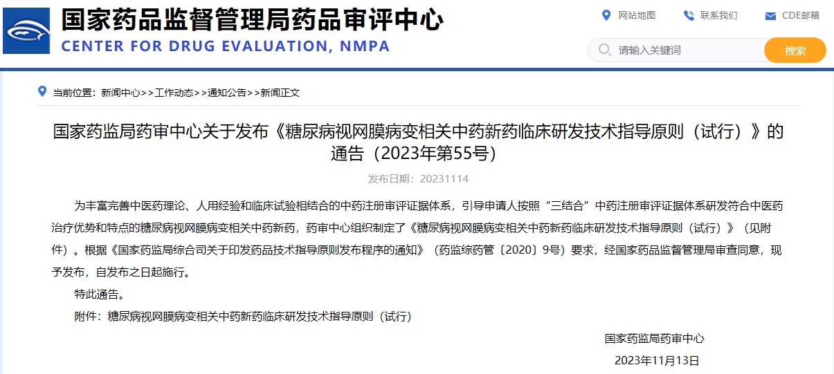 國家藥監(jiān)局藥審中心關(guān)于發(fā)布《糖尿病視網(wǎng)膜病變相關(guān)中藥新藥臨床研發(fā)技術(shù)指導(dǎo)原則(試行)》的通告(2023年第55號(hào))
