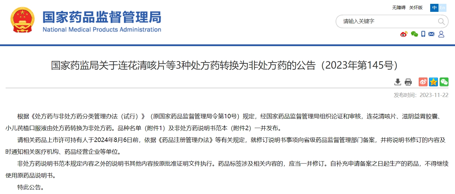 國家藥監(jiān)局關于連花清咳片等3種處方藥轉換為非處方藥的公告(2023年第145號)