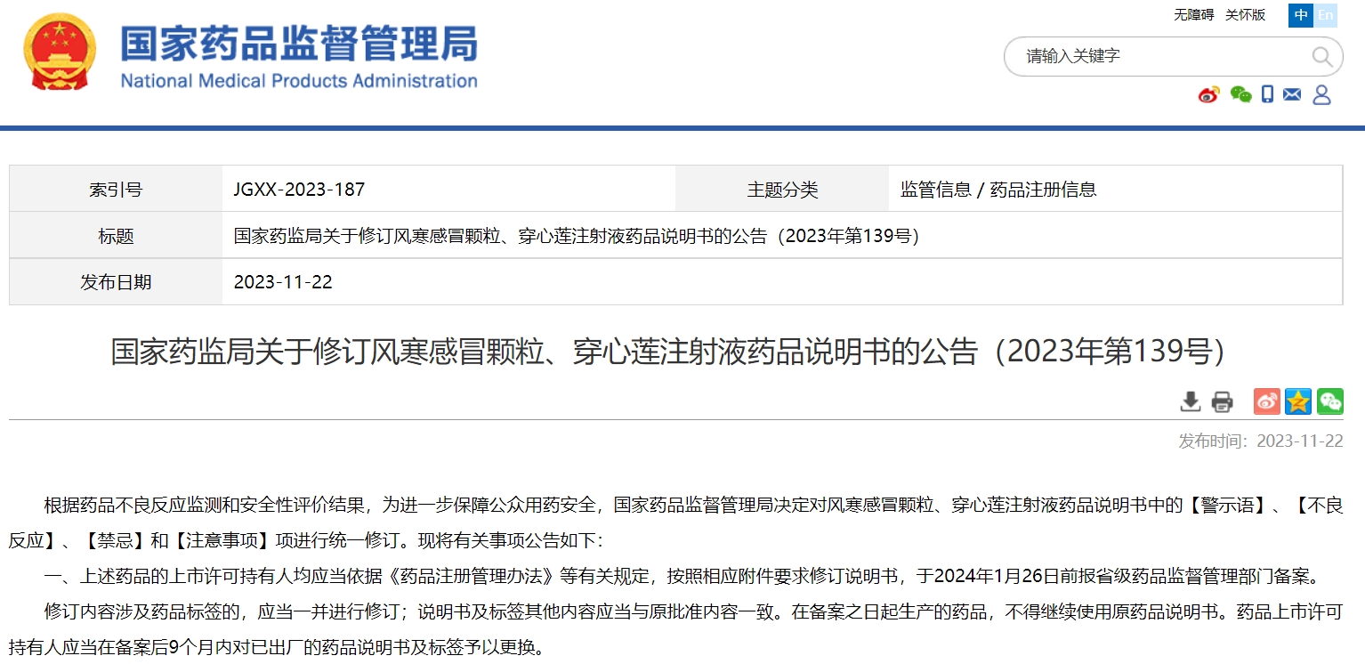 國家藥監(jiān)局關于修訂風寒感冒顆粒、穿心蓮注射液藥品說明書的公告(2023年第139號)