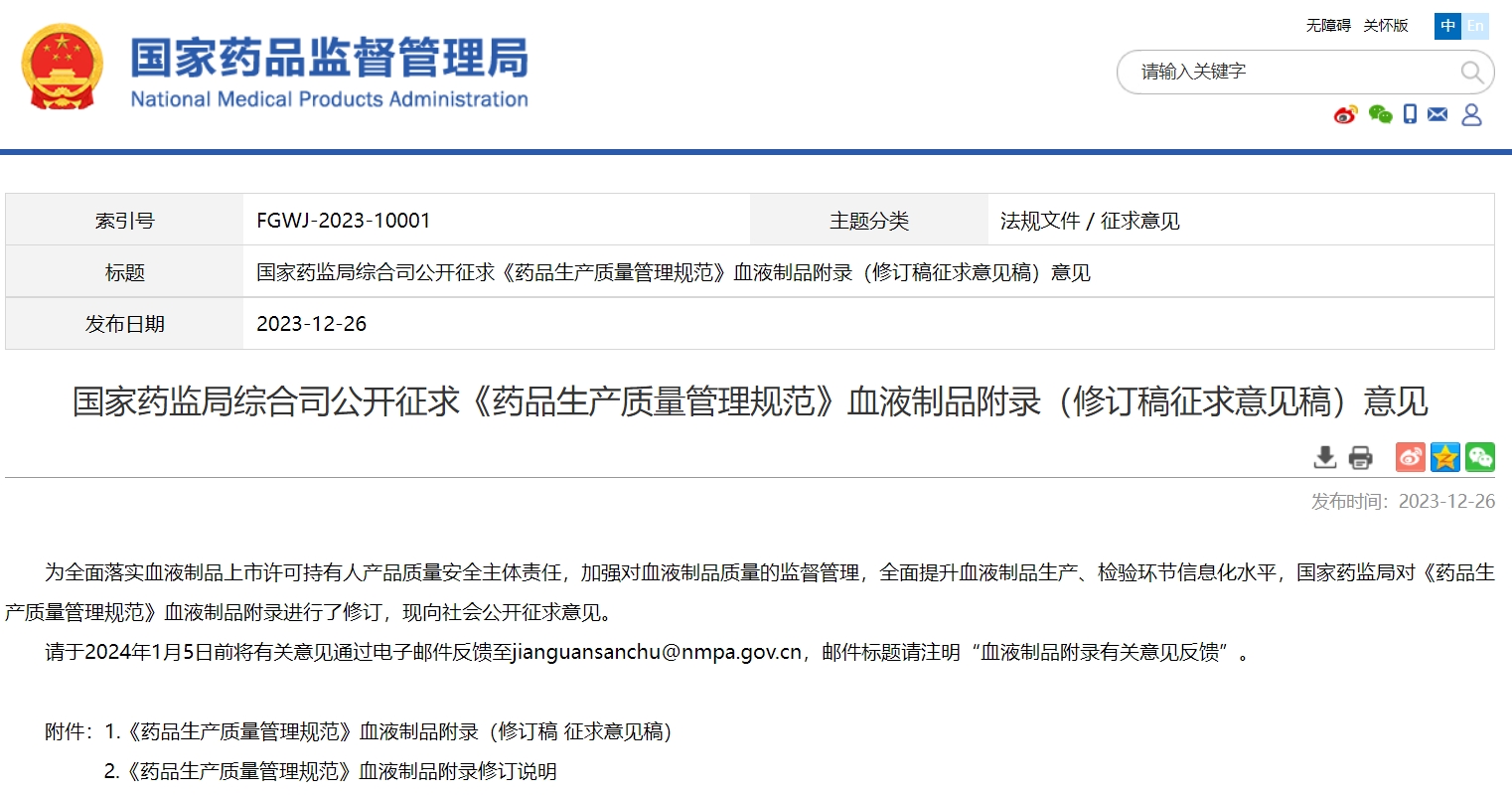 國(guó)家藥監(jiān)局綜合司公開(kāi)征求《藥品生產(chǎn)質(zhì)量管理規(guī)范》血液制品附錄(修訂稿征求意見(jiàn)稿)意見(jiàn)