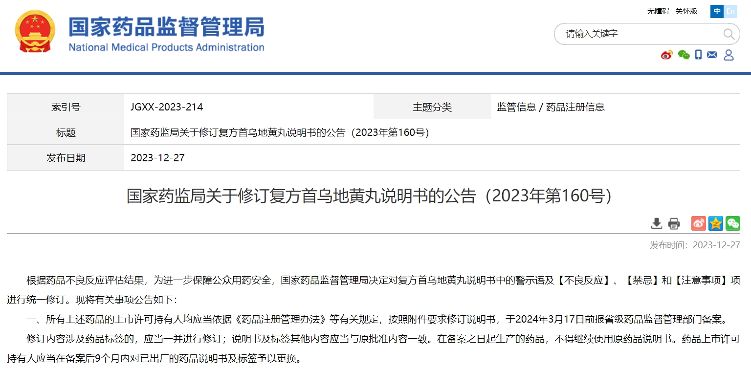 國(guó)家藥監(jiān)局關(guān)于修訂復(fù)方首烏地黃丸說(shuō)明書的公告(2023年第160號(hào))