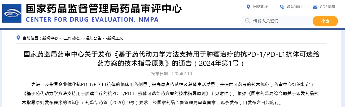 國家藥監(jiān)局藥審中心關(guān)于發(fā)布《基于藥代動力學(xué)方法支持用于腫瘤治療的抗PD-1/PD-L1抗體可選給藥方案的技術(shù)指導(dǎo)原則》的通告(2024年第1號)