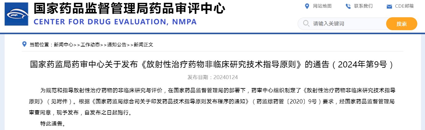 國(guó)家藥監(jiān)局藥審中心關(guān)于發(fā)布《放射性治療藥物非臨床研究技術(shù)指導(dǎo)原則》的通告(2024年第9號(hào))