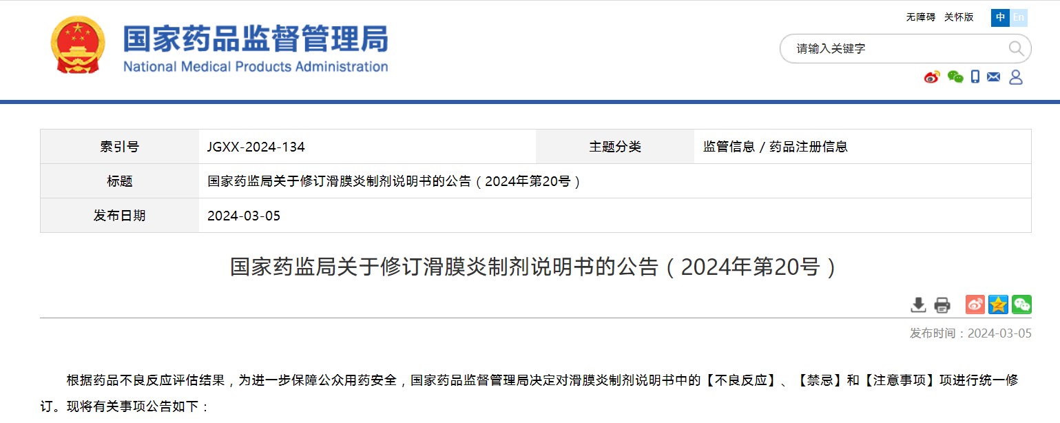 國(guó)家藥監(jiān)局關(guān)于修訂滑膜炎制劑說(shuō)明書(shū)的公告(2024年第20號(hào))
