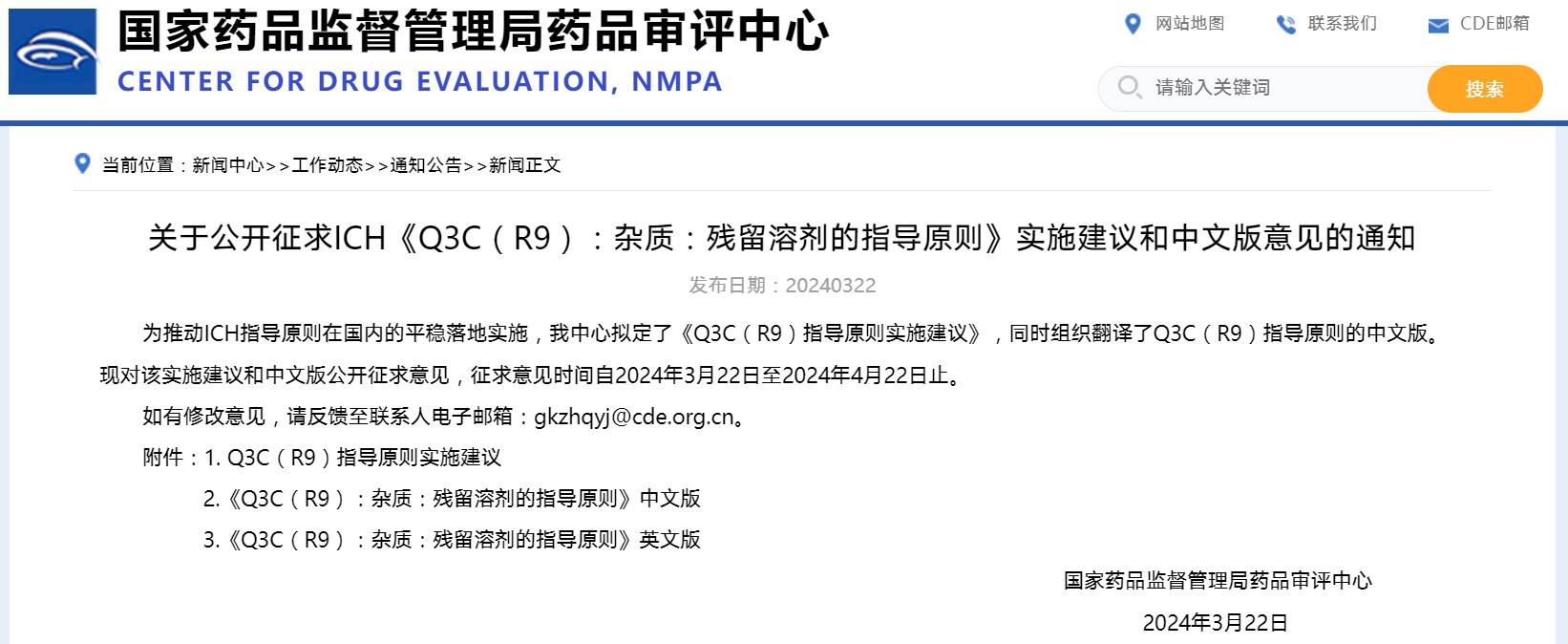關(guān)于公開征求ICH《Q3C(R9):雜質(zhì):殘留溶劑的指導(dǎo)原則》實(shí)施建議和中文版意見的通知