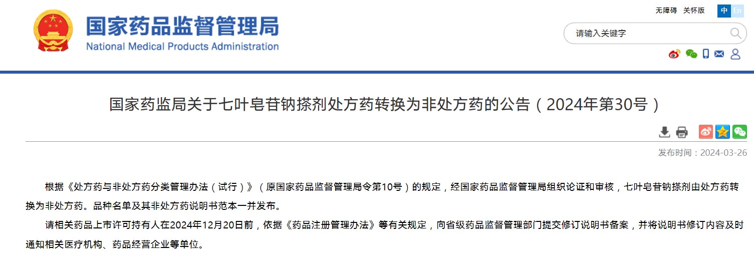 國家藥監(jiān)局關(guān)于七葉皂苷鈉搽劑處方藥轉(zhuǎn)換為非處方藥的公告(2024年第30號)