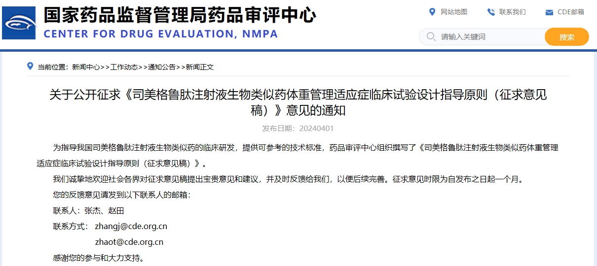 關(guān)于公開(kāi)征求《司美格魯肽注射液生物類(lèi)似藥體重管理適應(yīng)癥臨床試驗(yàn)設(shè)計(jì)指導(dǎo)原則(征求意見(jiàn)稿)》意見(jiàn)的通知