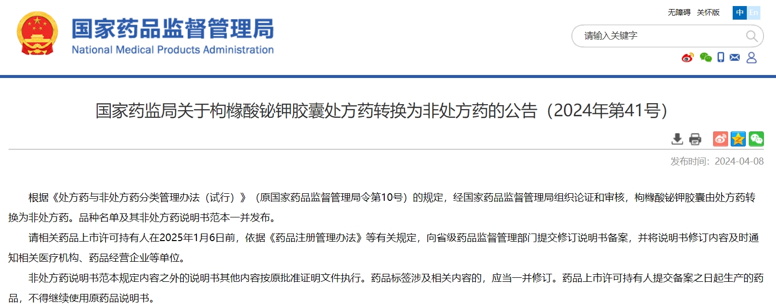 國(guó)家藥監(jiān)局關(guān)于枸櫞酸鉍鉀膠囊處方藥轉(zhuǎn)換為非處方藥的公告(2024年第41號(hào))