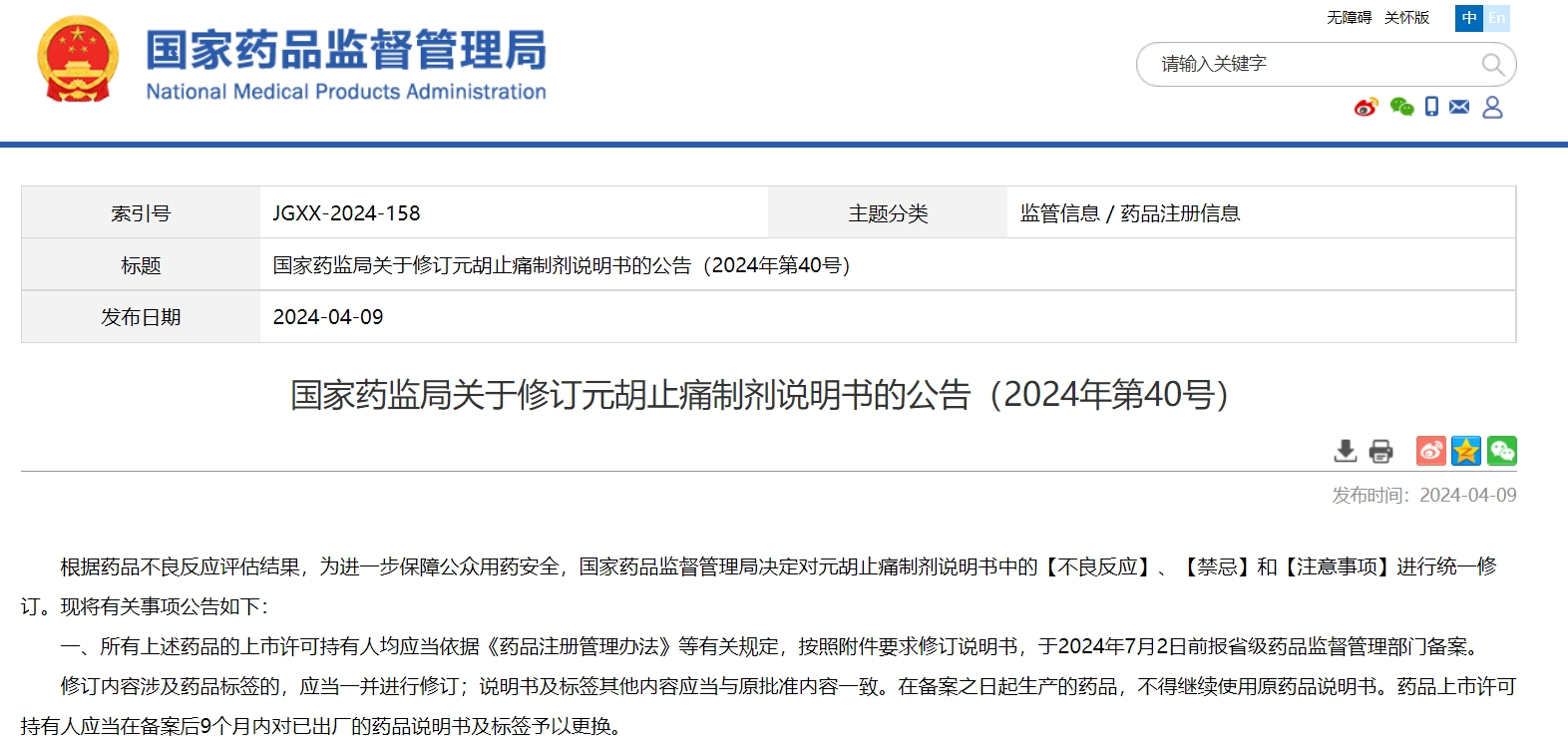 國(guó)家藥監(jiān)局關(guān)于修訂元胡止痛制劑說(shuō)明書(shū)的公告(2024年第40號(hào))