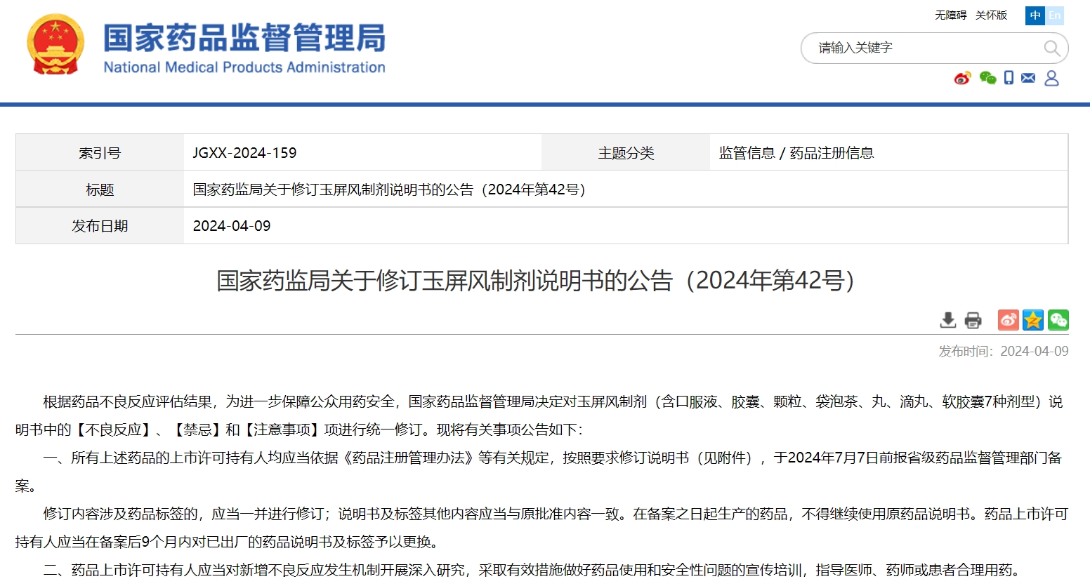 國(guó)家藥監(jiān)局關(guān)于修訂玉屏風(fēng)制劑說(shuō)明書(shū)的公告(2024年第42號(hào))