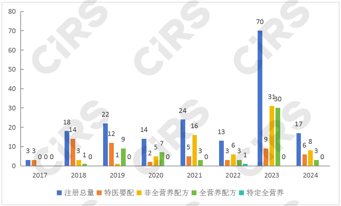 自2017年第一款特醫(yī)嬰配產(chǎn)品注冊(cè)成功后,特醫(yī)食品注冊(cè)大門(mén)正式打開(kāi)。下圖可知,特醫(yī)嬰配呈現(xiàn)高開(kāi)低走的趨勢(shì),其注冊(cè)主要集中于2018年和2019年,非全營(yíng)養(yǎng)配方的注冊(cè)則集中于2021和2023年。2022年總注冊(cè)量較少,但注冊(cè)產(chǎn)品類(lèi)型增多,且新增了首款特定全營(yíng)養(yǎng)配方食品。2023年新增了首款增稠組件,注冊(cè)類(lèi)型主要集中于全營(yíng)養(yǎng)和非全營(yíng)養(yǎng)產(chǎn)品,其占比高達(dá)87%。相比2022年注冊(cè)量,2023年呈現(xiàn)爆發(fā)式增長(zhǎng)。2024年第一季度已新增17款產(chǎn)品,由此可見(jiàn)2024年的產(chǎn)品獲批勢(shì)頭強(qiáng)勁,而特定全營(yíng)養(yǎng)食品依然是需要繼續(xù)突破的大關(guān)。