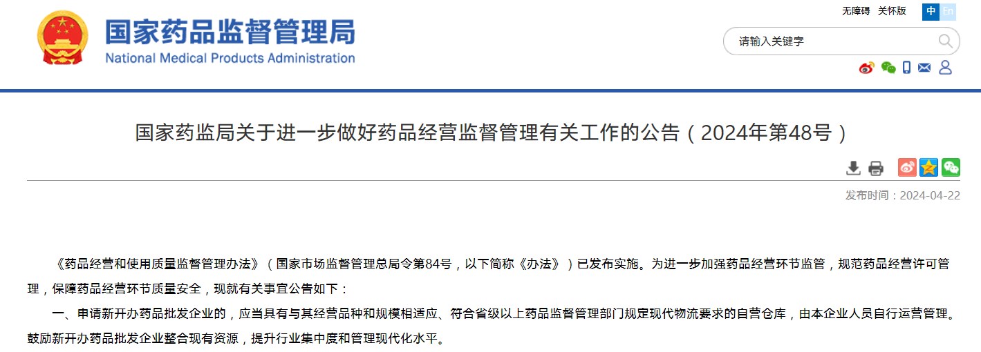 國(guó)家藥監(jiān)局關(guān)于進(jìn)一步做好藥品經(jīng)營(yíng)監(jiān)督管理有關(guān)工作的公告(2024年第48號(hào))