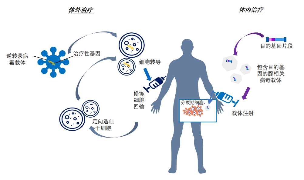 根據(jù)治療途徑,基因治療可分為體內(nèi)基因治療和體外基因治療。其中體內(nèi)基因治療是指將攜帶治療性基因的病毒或非病毒載體直接遞送到患者體內(nèi);體外基因治療則指將患者的細(xì)胞在體外進(jìn)行遺傳修飾后回輸。